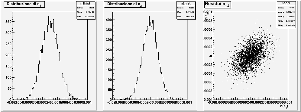 - differenza tra i valori misurati e quelli attesi di n(λ1) e n(λ2), quello bidimensionale delle differenze per le due lunghezze d'onda, e calcolare il coefficiente di correlazione.