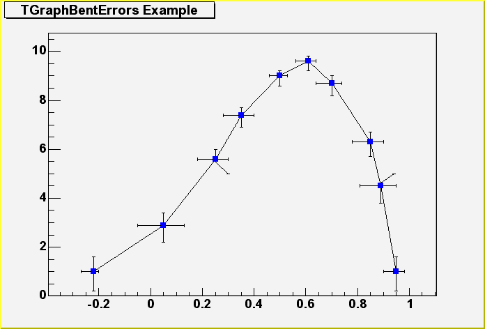 ______________________________________________________________________________ A TGraphBentErrors is a TGraph with bent, assymetric error bars. The various format options to draw a TGraphBentErrors are explained in TGraphBentErrors::Paint. The picture below has been generated by the following macro: FIXME There are 2 bent error bars in the picture, not one! ------------------------------------------------------------------------ { gROOT->Reset(); Int_t n = 10; Double_t x[n] = {-0.22, 0.05, 0.25, 0.35, 0.5, 0.61,0.7,0.85,0.89,0.95}; Double_t y[n] = {1,2.9,5.6,7.4,9,9.6,8.7,6.3,4.5,1}; Double_t exl[n] = {.05,.1,.07,.07,.04,.05,.06,.07,.08,.05}; Double_t eyl[n] = {.8,.7,.6,.5,.4,.4,.5,.6,.7,.8}; Double_t exh[n] = {.02,.08,.05,.05,.03,.03,.04,.05,.06,.03}; Double_t eyh[n] = {.6,.5,.4,.3,.2,.2,.3,.4,.5,.6}; Double_t exld[n] = {.0,.0,.0,.0,.0,.0,.0,.0,.0,.0}; Double_t eyld[n] = {.0,.0,.05,.0,.0,.0,.0,.0,.0,.0}; Double_t exhd[n] = {.0,.0,.0,.0,.0,.0,.0,.0,.0,.0}; Double_t eyhd[n] = {.0,.0,.0,.0,.0,.0,.0,.0,.05,.0}; gr = new TGraphBentErrors(n,x,y,exl,exh,eyl,eyh,exld,exhd,eyld,eyhd); gr->SetTitle("TGraphBentErrors Example"); gr->SetMarkerColor(4); gr->SetMarkerStyle(21); gr->Draw("ALP"); }