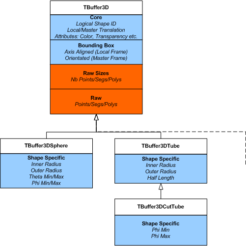 To cope with these situations the object buffer is filled out in negotiation with the viewer. TBuffer3D classes are conceptually divided into enumerated sections Core, BoundingBox, Raw etc (see TBuffer3D.h for more details).